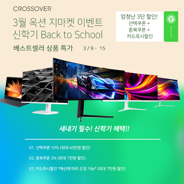 크로스오버는 자사의 인기 게이밍 고해상도 모니터들을 대상으로 ‘G마켓 옥션 3 빽투스쿨 프로모션’을 펼친다.