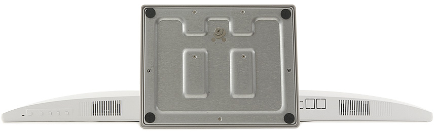 후면 중앙에 100mm x 100mm 베사홀이 제공되어 벽에 걸어 사용하거나 ARM 등에 장착할 수 있다. (툴리스 방식으로 손쉽게 스탠드를 분리할 수 있다.) 또한 고급형 모델답게 다양한 단자가 설치된 것도 확인할 수 있다. PC 연결을 위한 DP단자를 비롯해 PC뿐만 아니라 노트북, IPTV, 게임콘솔 등 다양한 디바이스 연결을 위한 2개의 HDMI 단자를 제공하며 헤드폰 연결을 위한 오디오 OUT 단자, 전원 단자 등이 설치되어 있다. (리모콘 사용을 위한 IR 센서도 설치되어 있다.)