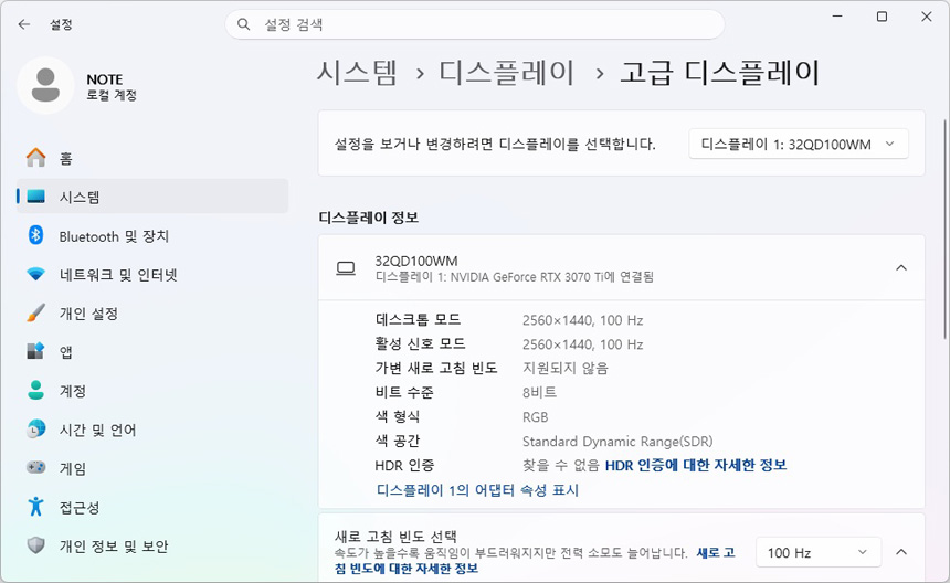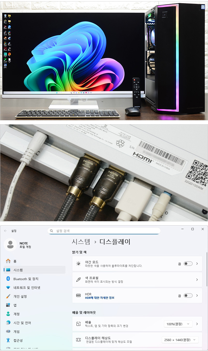 테스트를 위해 책상에 모니터를 설치한 모습으로 32형 대화면 모델답게 크기가 상당한 것을 확인할 수 있다. 슬림 베젤을 적용해 크기를 최소화 하긴 했지만 32형 대화면 모니터 이기 때문에 넉넉한 여유공간 확보는 필수적이라 할 수 있다. HDR 지원모델 답게 설정이 활성화 된 것을 확인할 수 있으며 3개의 입력단자를 지원해 다양한 디바이스와 연결해 활용할 수 있다.