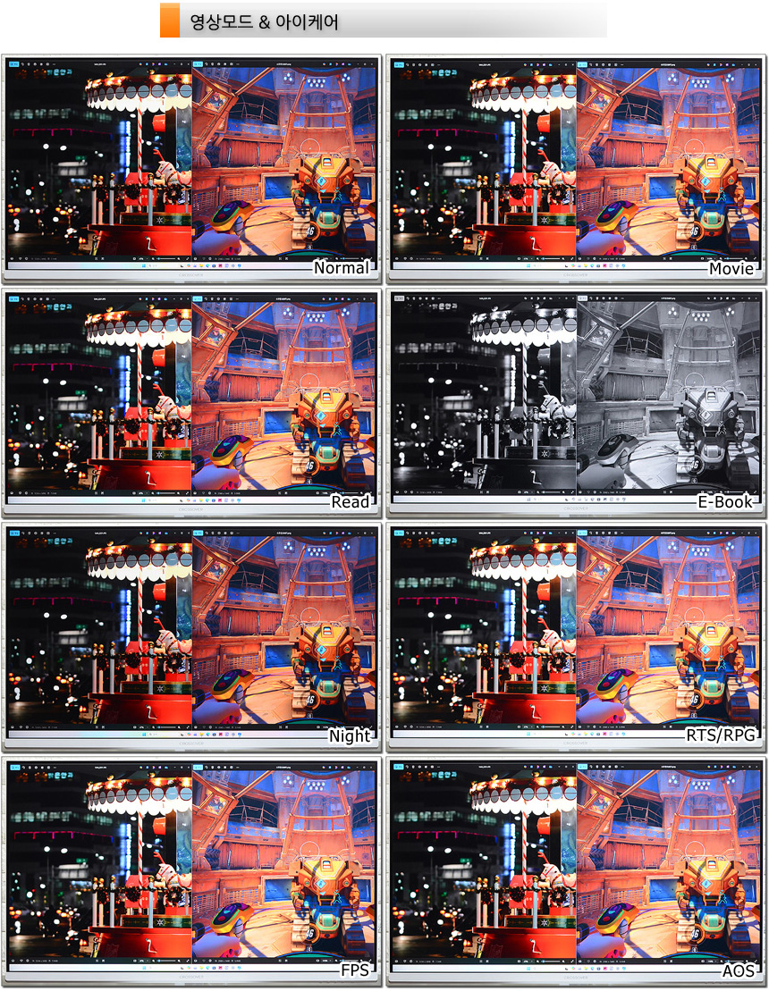 다양한 화면모드 지원으로 컨텐츠에 최적화된 영상을 즐길 수 있다. 상단의 사진은 지원 모드를 비교한 모습으로 (노멀 50% 밝기) 영상의 밝기와 명암등이 달라지는 것을 확인할 수 있었다. 평소에는 낮은 밝기로 사용하다가 게임이나 동영상 감상시 손쉽게 밝기를 높일 수 있다. (리모콘에서 핫키를 지원해 편하게 설정할 수 있다.)