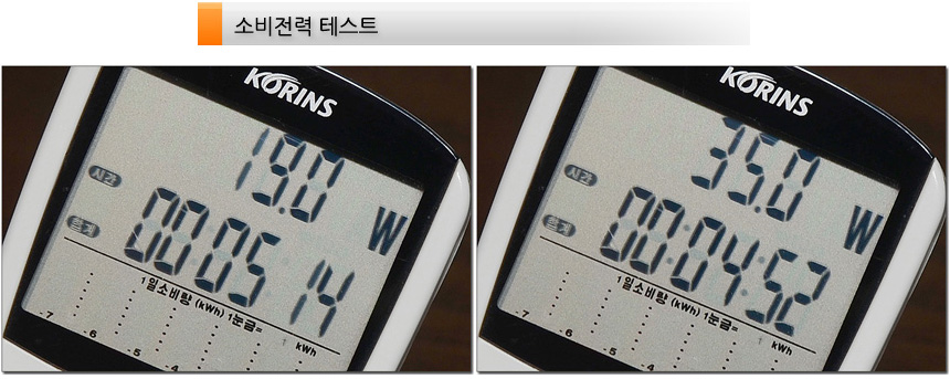 소비전력 테스트를 진행하고 있는 모습으로 32형 대화면을 지원하지만 소비전력이 높지 않은 것을 확인할 수 있다. 100% 밝기에서도 35W 였으며 50% 밝기에서는 19W로 소비전력이 줄어드는 것을 확인할 수 있었다.
