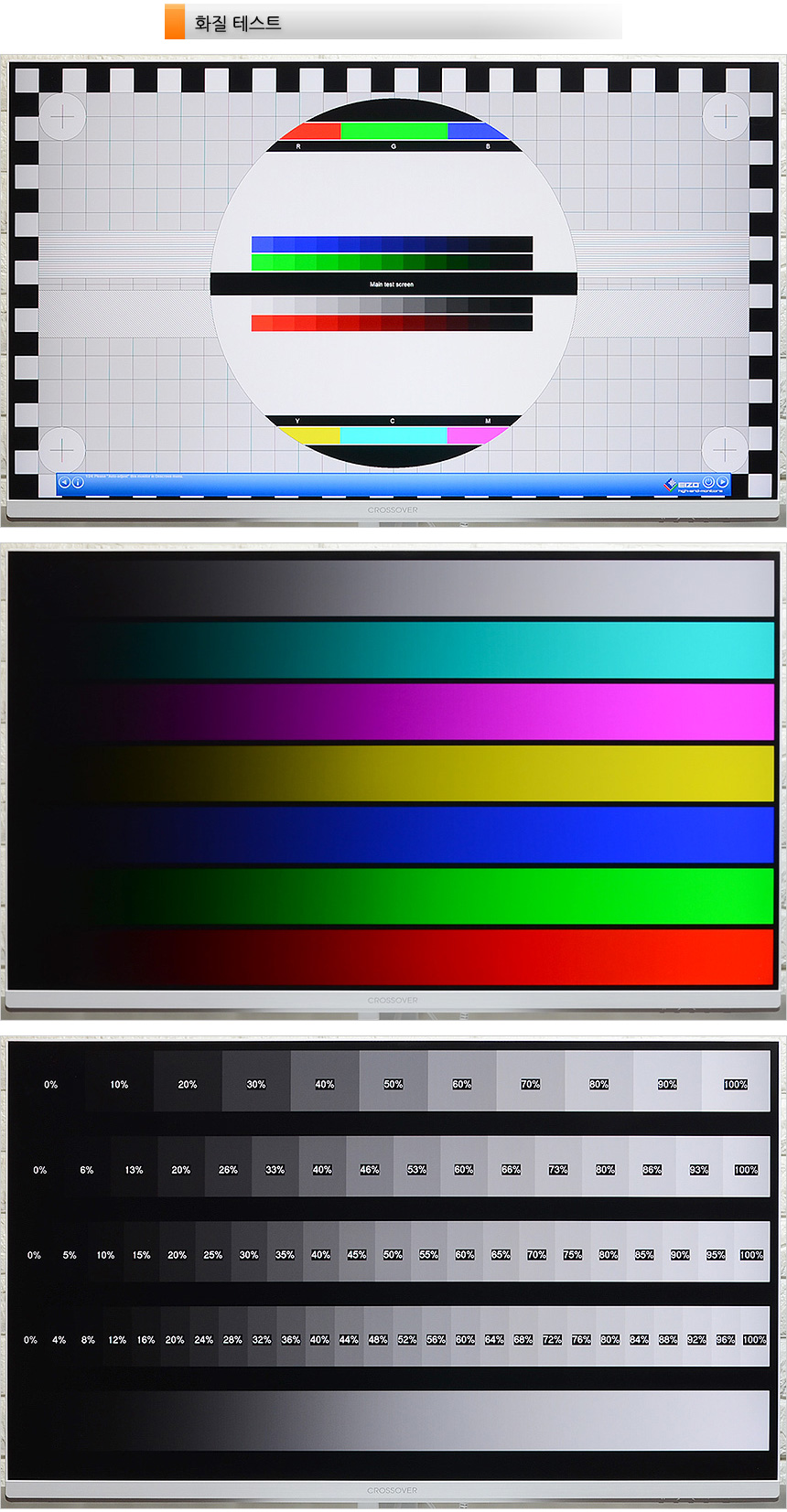 태스트 프로그램을 이용해 화질 테스트를 진행하고 있는 모습으로 대기업 IPS 패널을 사용한 모니터 특유의 진한 발색이 인상적이었으며 10억 7천만 컬러를 지원해 색의 변화가 자연스러운 것을 확인할 수 있었다. 350cd/㎡로 밝기도 높은 편이며 색 재현력도 상당히 뛰어나 가정용 뿐만 아니라 작업용 모니터로도 충분히 활용할 수 있다. 또한 대부분의 IPS 모니터와 같이 1,000 : 1 의 고정 명암비를 지원해 그레이스케일 차트를 확연히 구분할 수 있었다.
