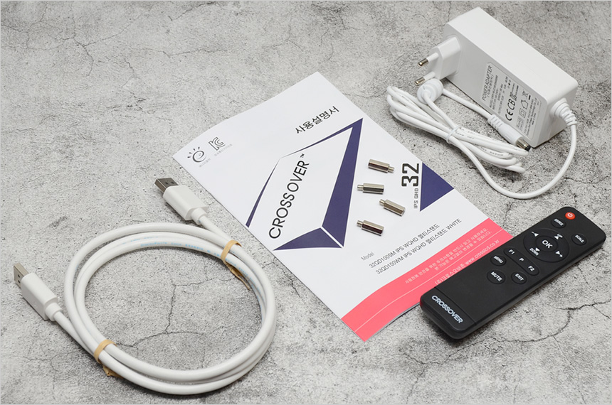 액세서리의 모습으로 케이블 일체형 전원 어댑터와 사용설명서, DP 케이블, 베사 연장볼트, 리모콘이 포함된 것을 확인할 수 있다.