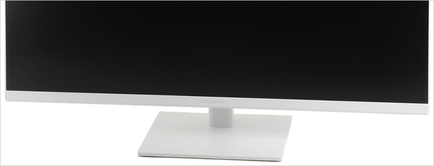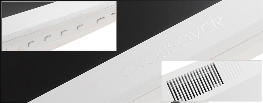 모니터 전면 하단부의 모습으로 중앙에 크로스오버 레터링이 세겨져 있으며 측면 하단에는 모니터 환경설정을 위한 OSD 버튼과 상태표시 LED, 2개의 3W 스피커가 장착된 것을 확인할 수 있다.