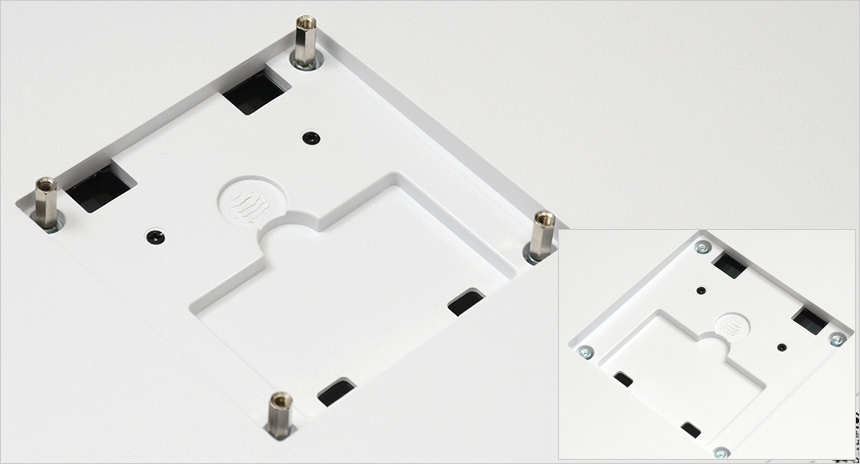 멀티스탠드의 모습으로 하단에 홀이 설치되어 깔끔하게 케이블을 정리할 수 있으며 바닥면에는 고무패드가 설치되어 미끄러짐을 방지한다.