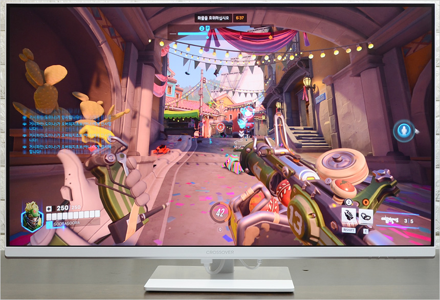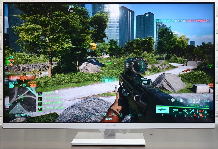 FPS 게임 오버워치2 와 배틀필드 2042를 이용해 게임 테스트를 진행하고 있는 모습으로 60Hz 일반 모니터와는 부드러움에서 분명한 차이를 경험할 수 있었으며 10억 7천만 컬러의 IPS 패널 탑재 모니터 답게 진하고 선명한 컬러 표현이 인상적이었다. 응답속도도 5ms로 짧은 편으로 잔상으로 인한 불편이 없었으며 조준선을 지원해 사격 정확성을 높일 수 있었으며 밝기가 상당히 높고 리모콘으로 화면모드를 손쉽게 변경할 수 있어 야간이나 실내맵에서도 명확하게 배경과 캐릭터를 구분할 수 있었다.