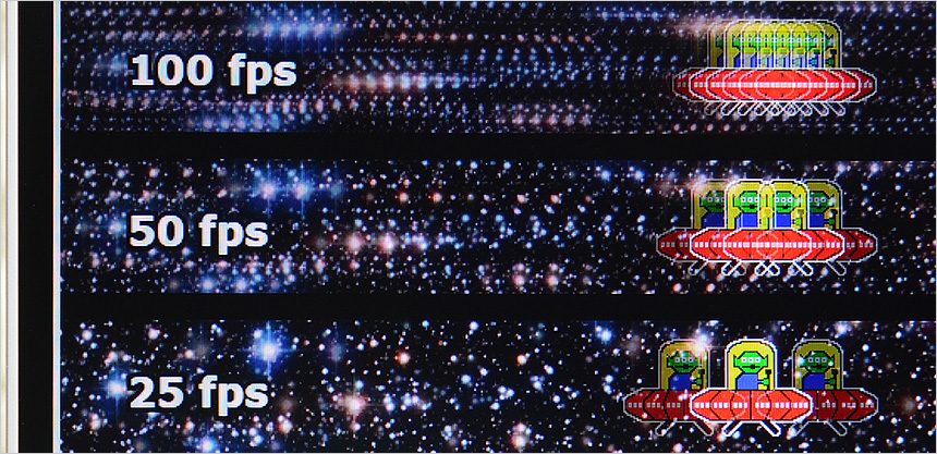 100Hz 주사율을 지원해 게임에서 순간적인 움직임도 정확하게 파악하고 빠르게 대응할 수 있다. 상단의 사진은 100Hz 주사율을 쉽게 확인할 수 있도록 하위 프레임과 같이 재생되는 영상 (960 Pixel Per Sec) 을 셔터스피드 1/20 로 촬영한 모습으로 프레임이 높아질수록 시간당 많은 화면이 뿌려지기 때문에 캐릭터의 수가 많은 것을 확인할 수 있다.