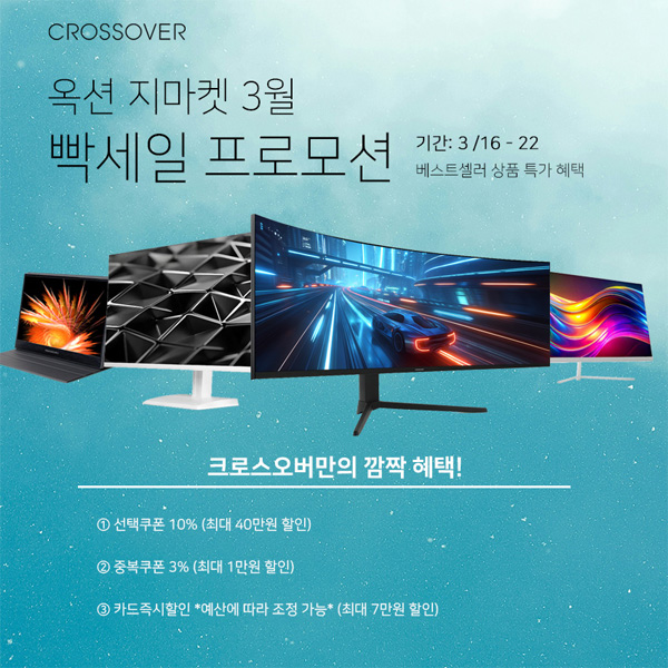 크로스오버는 자사의 인기 게이밍, 고해상도 모니터들을 대상으로 옥션 지마켓 2026년 3월 빡세일 프로모션을 실시한다.