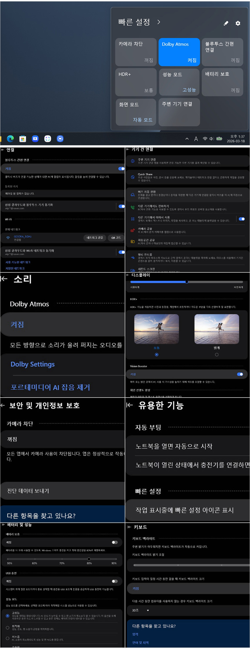삼성 Settings의 모습으로 (단축키 제공으로 손쉽게 실행할 수 있다.) 연결과 사운드 & 디스플레이 설정이 가능하며 퍼포먼스 설정과 자동부팅, USB 충전, 키보드 백라이트 설정 등을 지원한다. 또한 보안관련 설정에서 카메라 비활성화가 가능해 사생활 침해등을 미연에 방지할 수 있다.