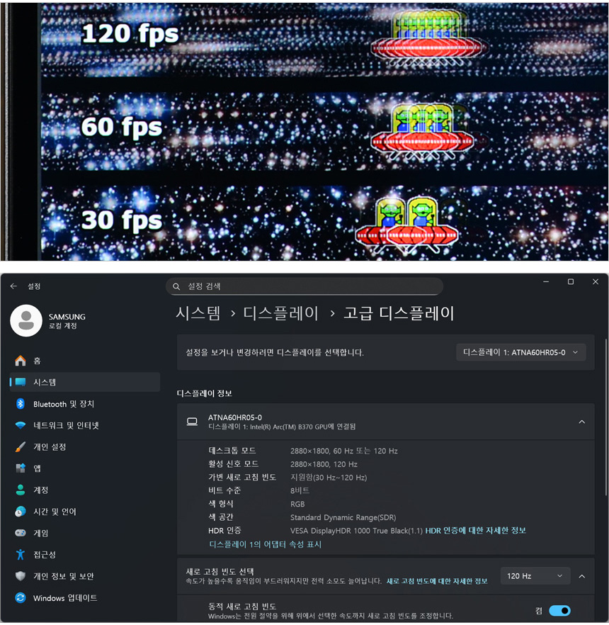 60Hz 주사율을 지원하는 일부 모델들과 달리 120Hz 주사율 지원으로 부드러운 영상을 즐길 수 있으며 영상에 맞게 주사율을 조정하는 가변주사율을 적용해 불필요한 배터리 소모를 최소화 했다. 상단의 사진은 120Hz 주사율을 쉽게 인지할 수 있도록 하위 프레임과 같이 재생되는 영상 (960 Pixel Per Sec) 을 셔터스피드 1/20 로 촬영한 모습으로 프레임이 낮을수록 캐릭터의 수가 적으며 프레임이 높아질수록 시간당 많은 화면이 뿌려지기 때문에 캐릭터의 수가 많은 것을 확인할 수 있다. (가변 주사율이 30Hz 까지 낮아진 것이 눈에띈다. 정적인 화면에서 더 배터리를 절약하기 위한 셋팅이다.)
