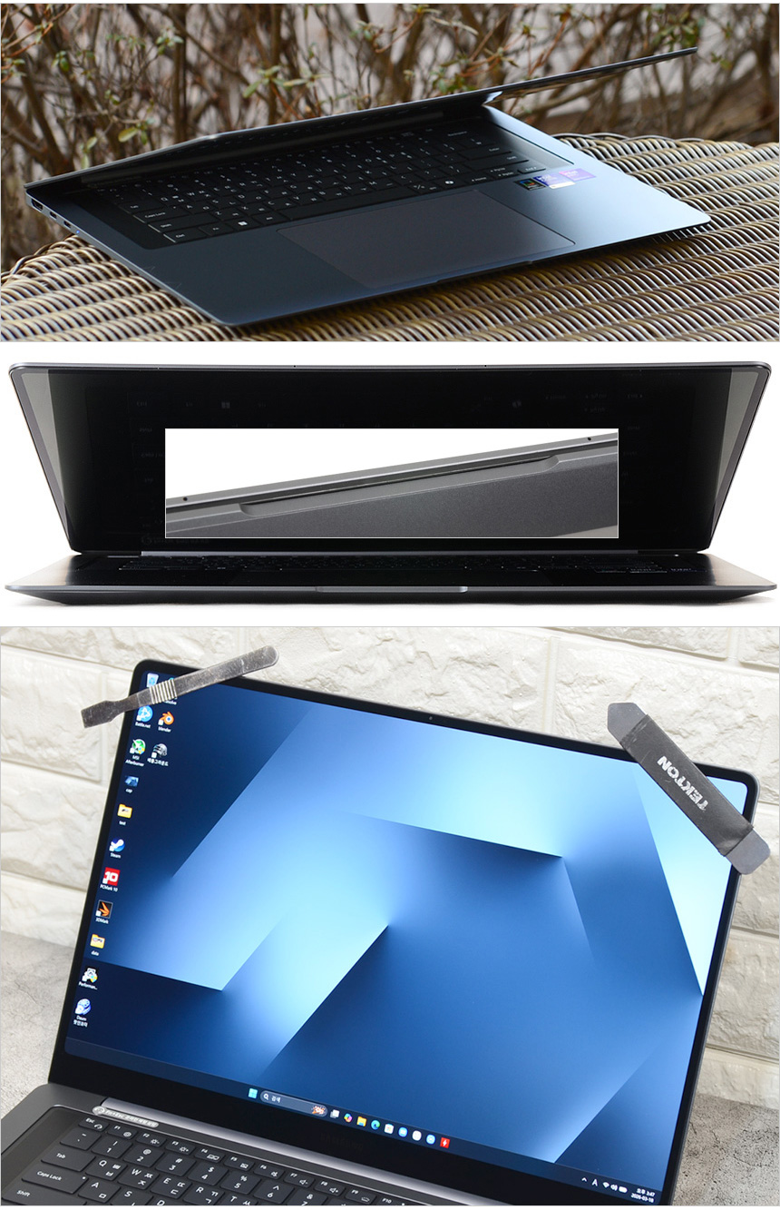 시야각 없는 다이나믹 AMOLED 2X 디스플레이를 탑재한 노트북으로 어떤 각도에서도 선명한 영상을 즐길 수 있다. 상단의 사진은 시야각 테스트를 진행하고 있는 모습으로 극단적인 각도에서도 시야각으로 왜곡은 발생하지 않았다.