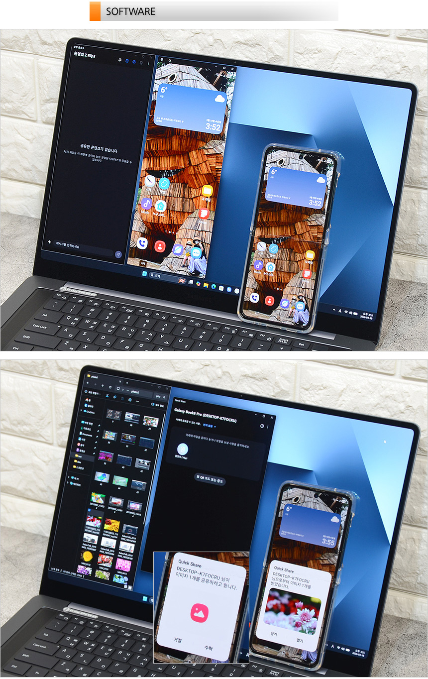 지원하는 전용 S/W부터 확인해 보도록 하자. 삼성 플로우를 사용하면 노트북에서 스마트폰을 컨트롤 할 수 있으며 무선으로 스마트폰과 간단하게 사진이나 영상, 파일을 전송할 수 있는 Quick Share를 지원해 유용하게 활용할 수 있다. 뿐만 아니라 태블릿과 연결해 화면을 공유할 수 있는 Second Screen을 통해 작업 효율성을 높일 수 있다.