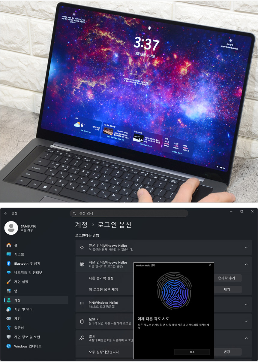 지문인식 기술을 지원해 높은 보안성과 편의성을 경험할 수 있다. (전원 버튼에 설치되어 있다.) 특히 삼성 녹스 보안 솔루션 까지 추가된 노트북으로 높은 보안이 필수적인 비즈니스 노트북으로도 손색이 없다.