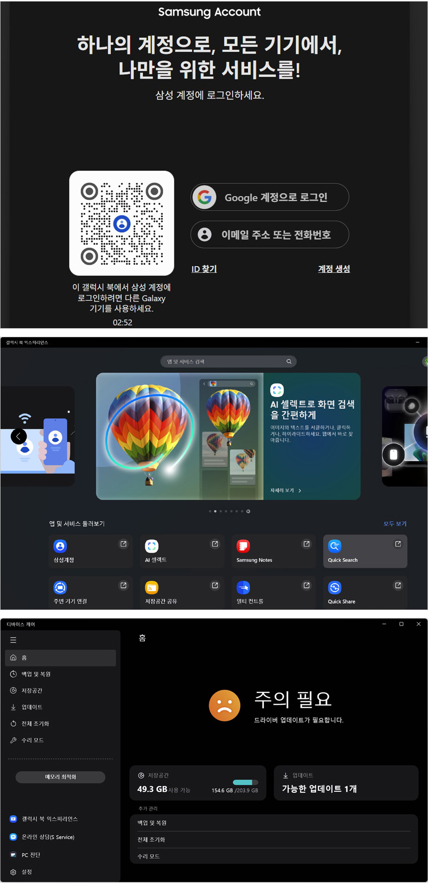삼성 어카운트에서 QR코드 로그인을 제공해 삼성계정이 필요한 앱을 편하게 실행할 수 있으며 갤럭시북 익스피리언스를 실행하면 설치된 앱을 손쉽게 실행할 수 있다. 또한 디바이스 케어를 실행하면 업데이터가 가능해 최상의 컨디션으로 노트북을 사용할 수 있다. (노트북 출시 초기이기 때문에 드라이버나 바이오스가 빈번하게 업데이트 될 것이다. 자주 디바이스 케어를 실행하기 바란다.)