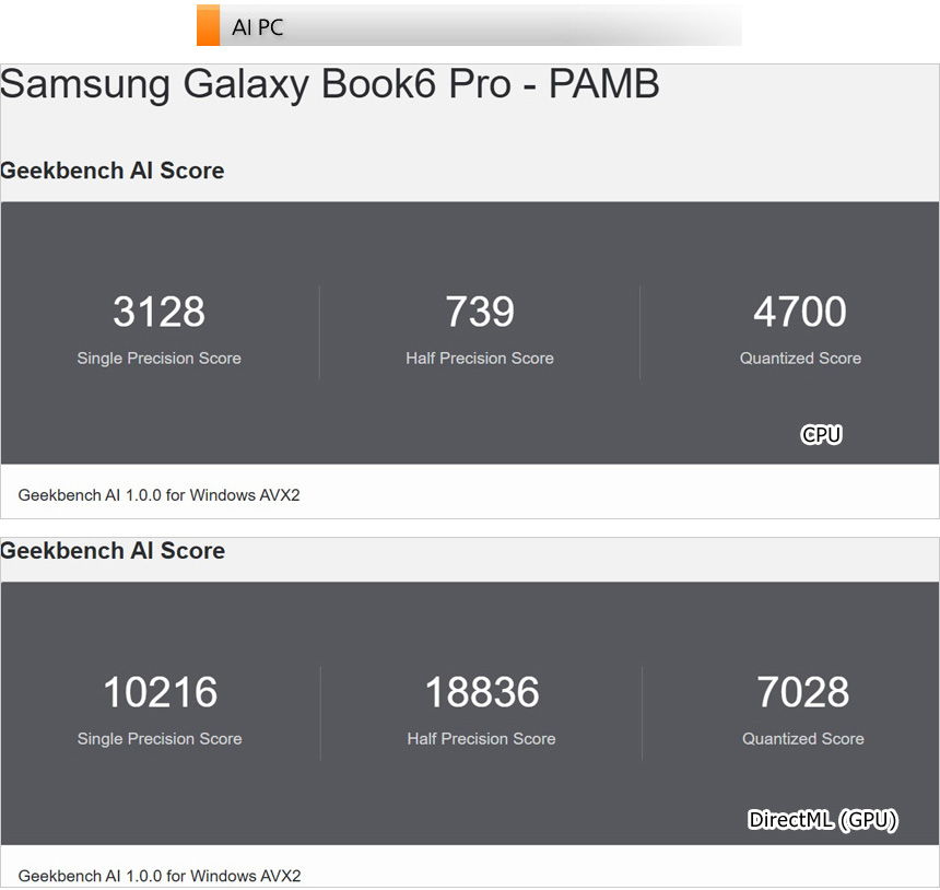 AI 전용 벤치마크 툴을 이용해 AI 성능 테스트를 진행하고 있는 모습으로 AI 에 특화된 CPU가 탑재된 모델답게 높은 스코어를 보여주었다. (내장그래픽 성능이 향상됨에 따라 전작대비 DirectML 의 스코어가 확연하게 높아졌다.)