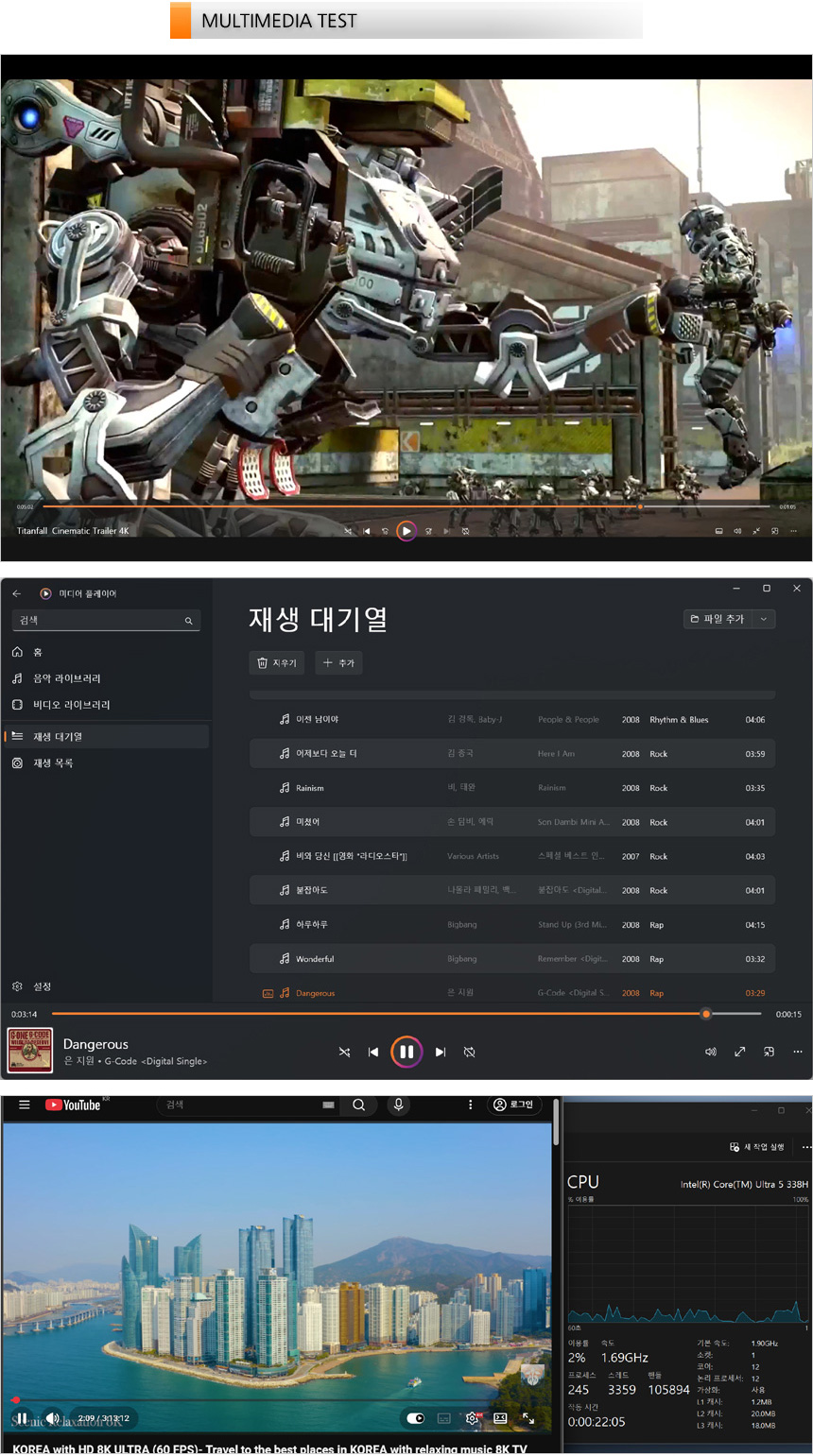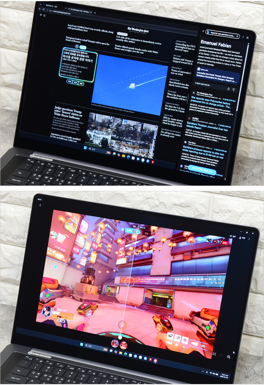 고화질 4K 동영상을 이용해 멀티미디어 테스트를 진행하고 있는 모습으로 AMOLED 특유의 진한 컬러감과 베사 HDR 기술 지원으로 깊이감 있는 영상을 즐길 수 있었으며 16형 대화면에 슬림 베젤 지원으로 높은 몰입감을 경험할 수 있었다. 폭발적인 사운드까지 더해진 노트북으로 동영상 감상용으로 유용하게 사용할 수 있을 것이다.