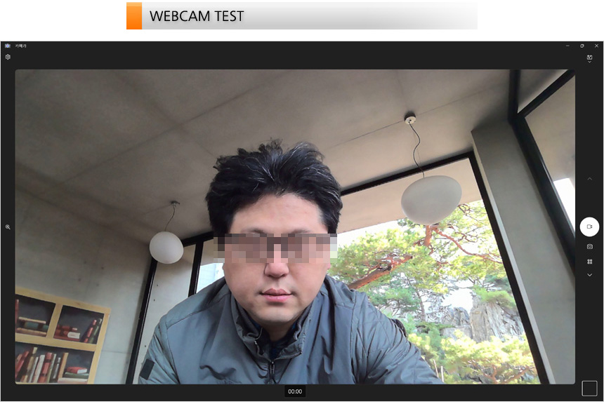 2MP 해상도를 지원하는 웹캠의 화질을 확인하고 있는 모습으로 HD 웹캠과는 확연히 비교되는 디테일과 색감을 보여주었다. (삼성 특유의 부드러운 피부톤 표현은 여전하다.) 특히 스튜디오 효과를 사용하면 배경을 날려 버리거나 사용자에게 화면이 맞춰지는 자동 프레이밍 등을 활용할 수 있어 화상화의 등에서 편하게 사용할 수 있다.