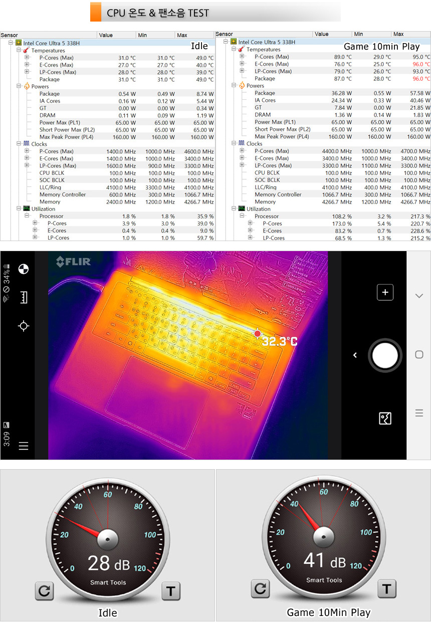 열화상 카메라를 이용해 게임 실행중 열분포를 확인했는데 상단중앙을 중심으로 열이 퍼져나가며 팜래스트 온도도 낮아 편하게 손을 올려두고 타이핑 할 수 있다. 뿐만 아니라 팬소음 테스트도 실행했는데 (최고 성능 모드) 캐주얼한 작업시에는 생활소음에 묻혀 팬소음이 들리지 않았으며 게임이나 영상편집 S/W 등을 실행했을 때에는 41dB 까지 팬소음이 높아지는 것을 확인할 수 있었다. (참고로 팬소음은 사무실 생활소음을 포함한 결과값이다. 이점 참조 바란다.)
