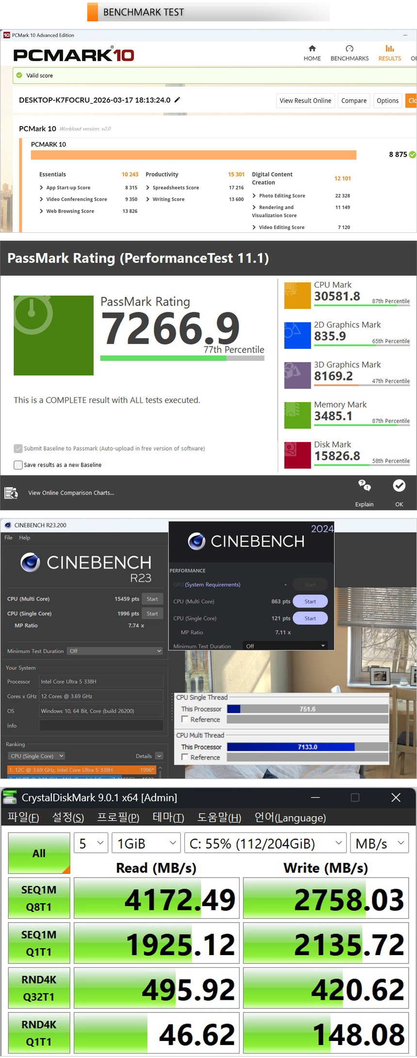 벤치마크 테스트를 진행하고 있는 모습으로 문서작업 뿐만 아니라 고성능을 필요로 하는 전문작업용 S/W도 부드럽게 실행할 수 있는 스코어를 보여주었다. 게이밍이나 크리에이터 노트북 수준은 아니지만 성능으로 인한 스트레스 없이 사용할 수 있을 것이다. (특히 그래픽관련 스코어 상승이 돋보인다.) @ 참고로 32GB 메모리를 지원하는 NT960XJG-K52A와 비교하면 스코어가 살짝 낮다.