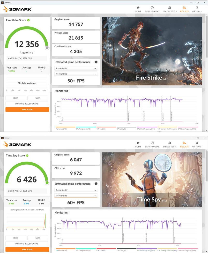 3D 성능을 확인하고 있는 모습으로 루나레이크나 에로우레이크가 탑재된 전작과 확연히 비교되는 높은 스코어를 보여주었다. 구형 게이밍 노트북 수준의 3D 성능을 지원하는 모델로 Xess 업스케일링 기술만 활용하면 최신 게임도 원활하게 즐길 수 있다.