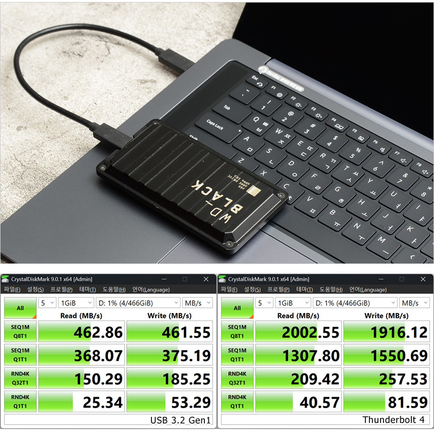 외장 SSD (USB 3.2 Gen2x2 지원제품) 를 이용해 썬더볼트 4의 속도를 테스트 하고 있는 모습으로 USB 3.2 Gen1과 확연한 차이를 보여주었다. 대용량 데이터 전송이 잦은 유저들이라면 만족하며 사용할 수 있을 것이다.