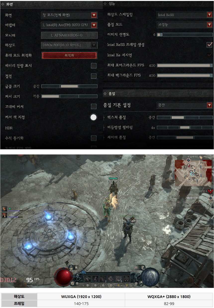 디아블로 4를 실행한 모습으로 XeSS 프레임 생성이 가능해 구형 게이밍 노트북 수준의 프레임으로 게임을 즐길 수 있었다. @ 150GB 대용량 게임으로 SSD에 설치가 불가해 외장 SSD에 설치해 테스트를 진행했다. SSD를 추가하고 게임을 설치해 실행하면 15프레임 정도 높은 성능으로 게임을 즐길 수 있다.