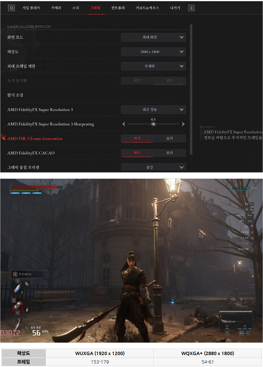 P의 거짓을 중간옵션에서 플레이 하고 있는 모습으로 FSR3 프레임 생성을 활성화 하면 프레임이 대폭 상승해 여유롭게 게임을 즐길 수 있다. (해상도는 WUXGA로 설정하고 FSR3 옵션을 품질이나 높음 정도로 설정해 좋은 화질로 게임을 즐기기 바란다.)