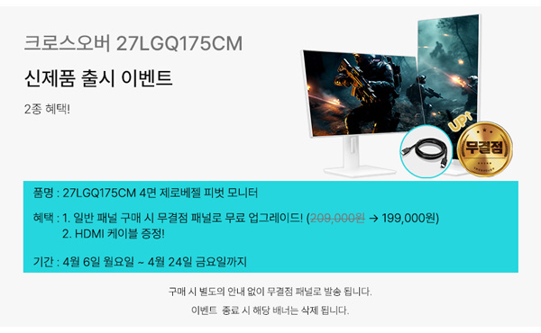 모든 오픈마켓을 대상으로 4월 6일(월) ~ 4월 24일(일)까지 약 19일간 진행되는 이번 출시기념 행사에서 27LGQ175CM 모니터 일반모델을 구입하면 무결점 모델로 업그레이드 돼서 출고된다.