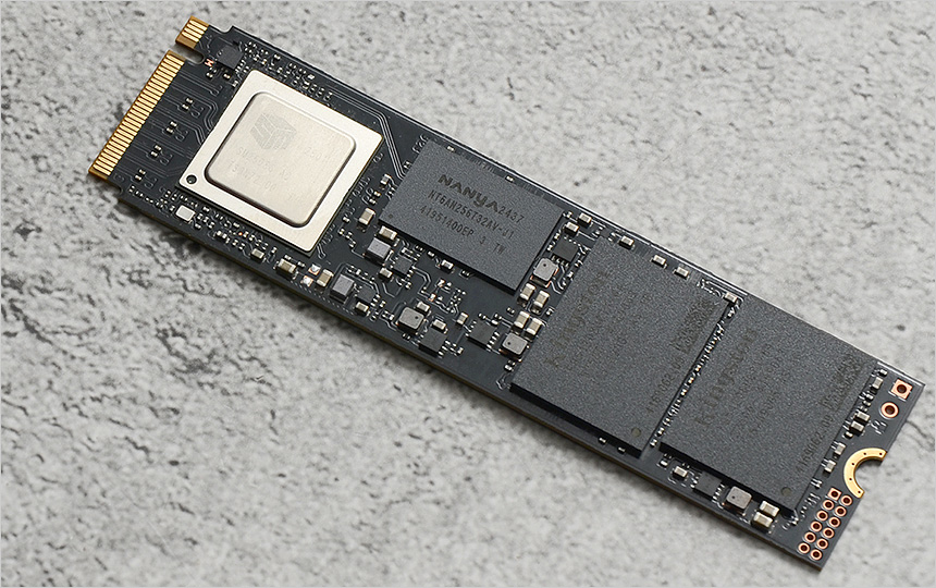 디램리스 제품들과 달리 NANYA DDR4 디램 캐시가 장착된 것을 확인할 수 있다. 참고로 디램이 장착되어 있으면 필요한 자료를 즉시 가져올 수 있어 더 빠른 속도를 구현하며 동일 작업시 낸드 플래시 사용을 최소화해 더 높은 안정성을 구현한다. (이런 이유로 디램탑재 모델이 더 비싼 가격에 판매되는 것이다.) 또한 발열제어에 탁월한 6nm 공정 기반의 실리콘 모션 SM2508 컨트롤러를 탑재해 안정성을 높였으며 12레이어 PCB 설계를 적용해 신호 품질을 높였으며 고부하 환경에서도 안정적이고 지속적인 성능을 구현한다.