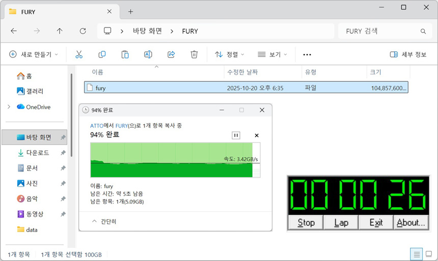 100GB 더미파일을 만든 후 파일 전송속도 테스트를 진행하고 있는 모습으로 3.5GB/s 정도의 빠른 속도를 보여 주었다. (시간은 26초가 소요되었다.) 고급형 PCIe 4.0 지원 모델이 30초 이상의 전송시간을 보여주며 보급형은 50초 이상의 긴 전송시간을 기록했다.