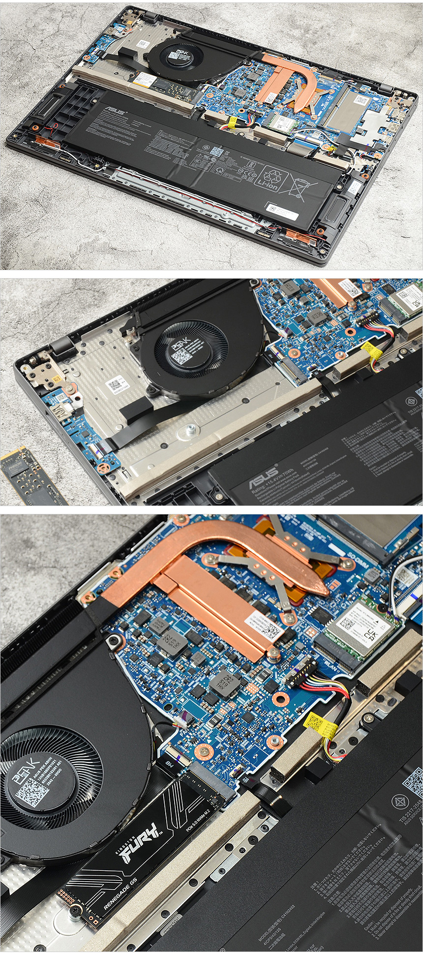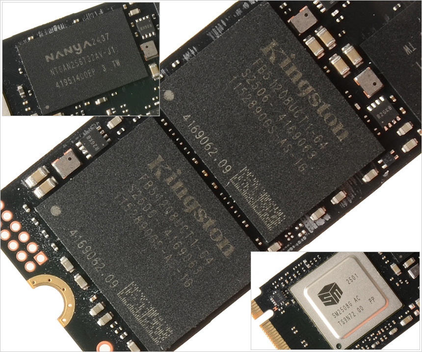 스티커를 제거한 전면 내부의 모습으로 낸드 플래시와 컨트롤러, 디램등이 부착된 것을 확인할 수 있다. 3D TLC NAND를 제품을 사용해 낮은 소비전력에서 강력한 성능을 구현한다. (참고로 3D NAND 는 좁은 셀간격으로 인해 전자가 누설되는 등의 현상이 발생하는 2D NAND 대비 저장용량 확보가 용이하며 전력 소모량을 낮춰 수명도 긴 장점을 가지고 있다.)