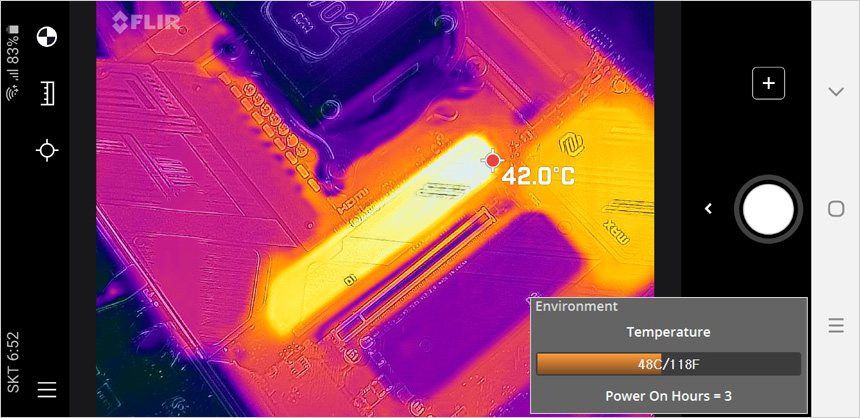 메인보드의 히트싱크를 부착한 상태에서 동일 테스트 후 표면 온도를 확인해 보았는데 온도가 대폭 낮아진 것을 확인할 수 있다.