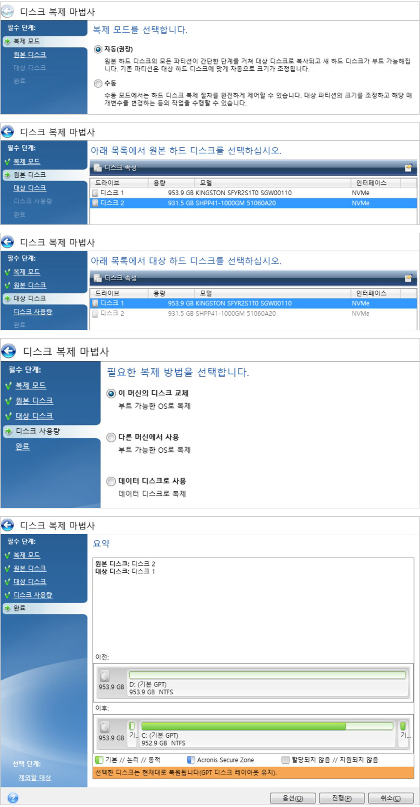 PC나 노트북의 SSD를 교체할 경우 새로 OS와 드라이버, S/W등을 설치해야 하는데 번거롭기도 하고 시간도 많이 소요된다. 이 때 디스크 복제 기능을 사용하면 빠른 시간에 셋팅을 마무리 할 수 있다. 상단의 사진은 디스크 복제를 실행한 모습으로 소스 (기존 SSD) 와 타겟 (킹스톤 FURY RENEGADE G5) 을 선택하고 실행 버튼만 누르면 자동으로 디스크를 복제하게 된다.