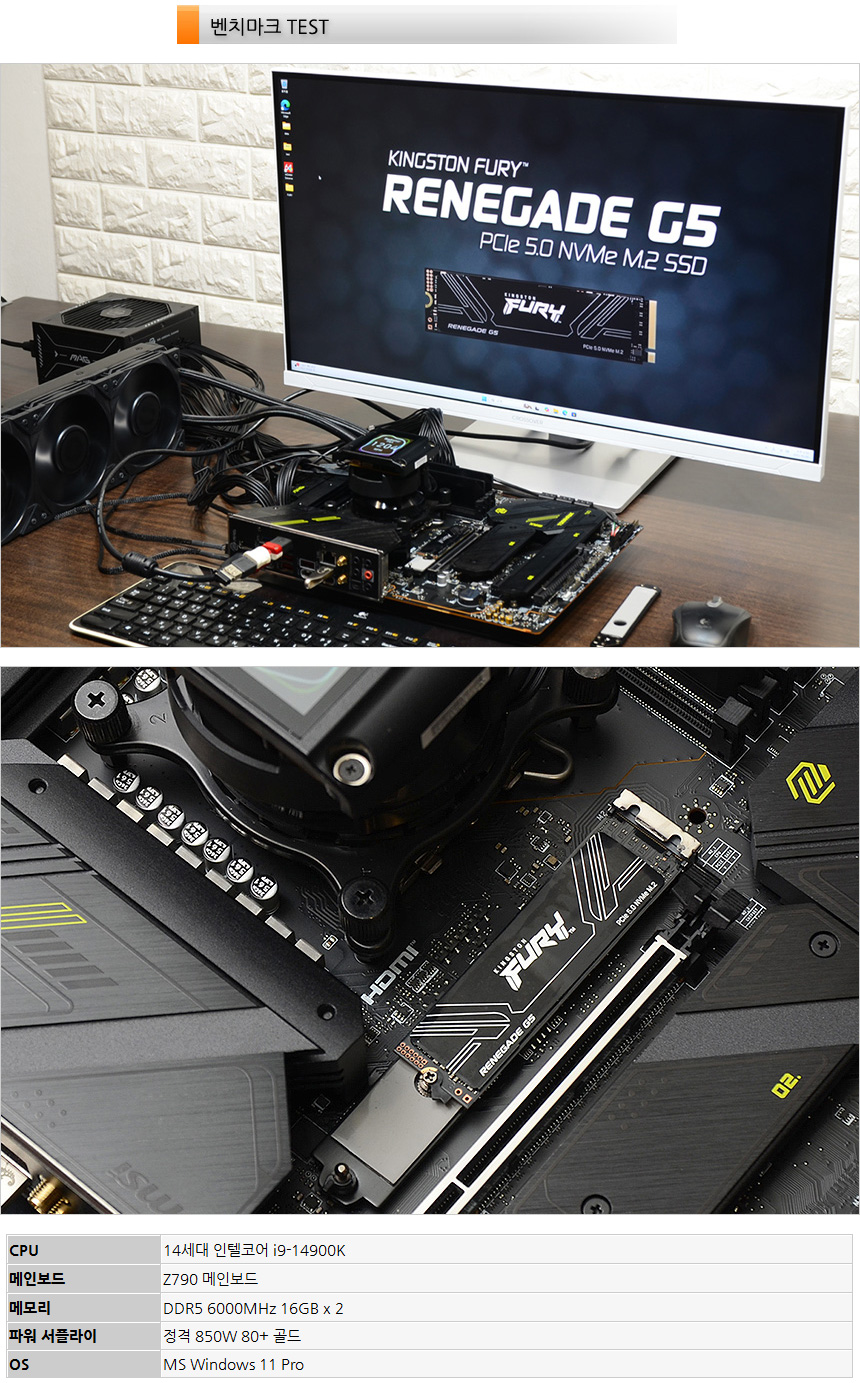 테스트 시스템의 모습으로 PCIe 5.0을 지원하는 Z790 칩셋 메인보드를 사용했으며 32GB DDR5 6000MHz 메모리와 850W 파워 등을 이용해 테스트를 진행했다. @ 테스트는 OS를 설치한 메인 SSD 형태로 진행했으며 메인보드 방열판을 장착했다.