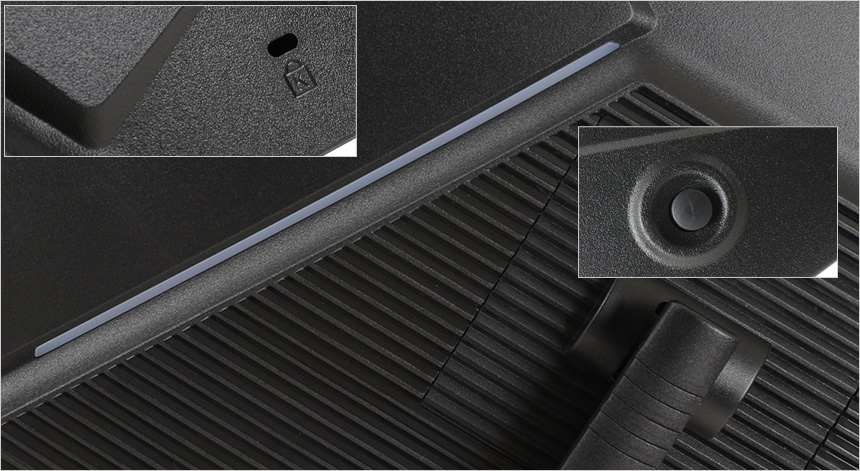 모니터 후면부의 모습으로 투구를 연상시키는 디자인이 인상이다. 하단에는 도난 방지를 위한 시큐리티 홀이 설치되어 있고 조그 다이얼이 장착되어 손쉽게 모니터 환경을 조정할 수 있다. (LED가 내장되어 모니터 상태를 손쉽게 파악할 수 있다.)