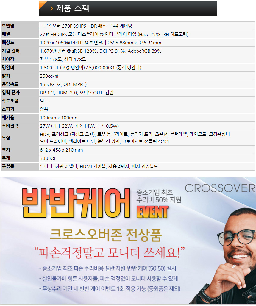 이번에 리뷰를 진행 할 크로스오버 279FG9 iPS-HDR 패스트144 게이밍은 구형PC나 엔트리급 게이밍PC 에서도 원활하게 사용할 수 있는 게이밍 모니터로 144Hz 주사율과 1ms 응답속도를 지원해 발로란트나 오버워치2, 배틀그라운드 등의 FPS 게임을 쾌적하게 플레이 할 수 있다. 특히 게이밍 모니터 명가인 크로스오버 모델답게 프리싱크 (지싱크 호환), 조준선, 블랙레벨 등 다양한 게임관련 기술을 지원하고 밝기도 상당히 높아 편하게 게임을 즐길 수 있다.