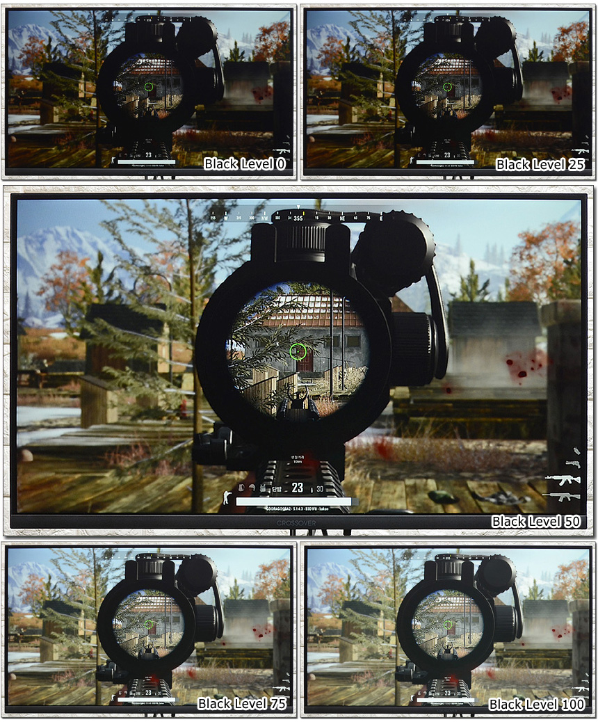블랙레벌 조정을 통해 게임에서 시인성을 높일 수 있다. (암부가 많거나 야간맵을 경우 블랙레벨을 조정하면 구분감을 높일 수 있다.) 단, 밝아지는 만큼 색감이 떨어지기 때문에 선명도와 시인성을 전반적으로 고려해 설정하기 바란다.