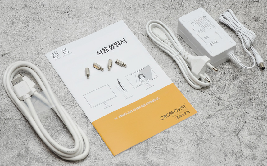 풀KIT 의 모습으로 모니터를 비롯해 전원 케이블과 전원 어댑터와, DP 케이블, 사용설명서가 제공되며 베사홀 연장볼트도 포함되어 있다.