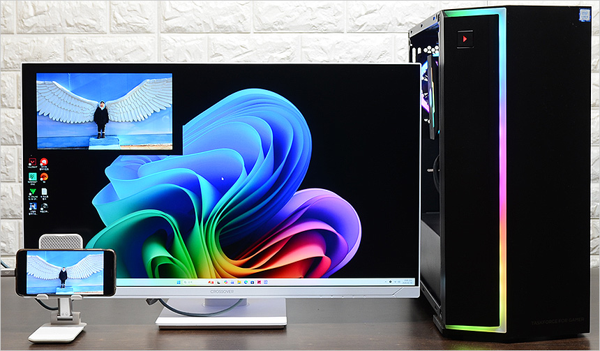 2대의 디바이스를 연결해 한화면에서 재생할 수 있는 PIP와 PBP 기능을 제공한다. 상단의 사진은 테스트를 진행하고 있는 모습으로 PIP 와 PBP 모두 완벽하게 작동하는 것을 확인할 수 있었다. (HDMI to C타입 케이블을 사용하면 스마트폰등과 편하게 연결할 수 있다.)