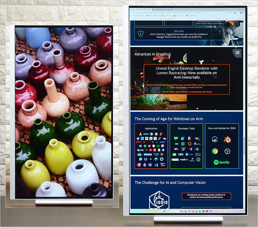 멀티스탠드 적용도 매력적인 부분이라 말씀드리고 싶다. 각도나 위치 조절에 한계가 있는 일반 모니터와 달리 어떤 환경에서도 사용자에 최적화된 각도 조절이 가능했으며 피벗 기능을 지원해 세로영상을 꽉찬 화면으로 즐길 수 있었다.