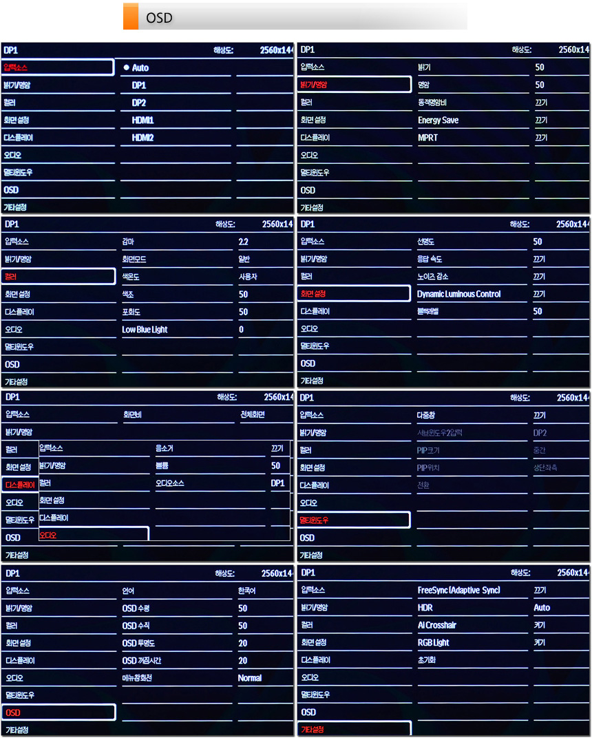 OSD 버튼에서 핫키를 지원해 자주 사용하는 기능을 빠르게 실행할 수 있다. (볼륨과 조준선, 입력소스 등을 설정할 수 있다.) 또한 메인메뉴 에서는 밝기나 명암 설정이 가능하며 화면, 색온도 설정이 가능할 뿐만 아니라 HDR, 프리싱크, 조명효과, 멀티윈도우 설정이 가능하다.
