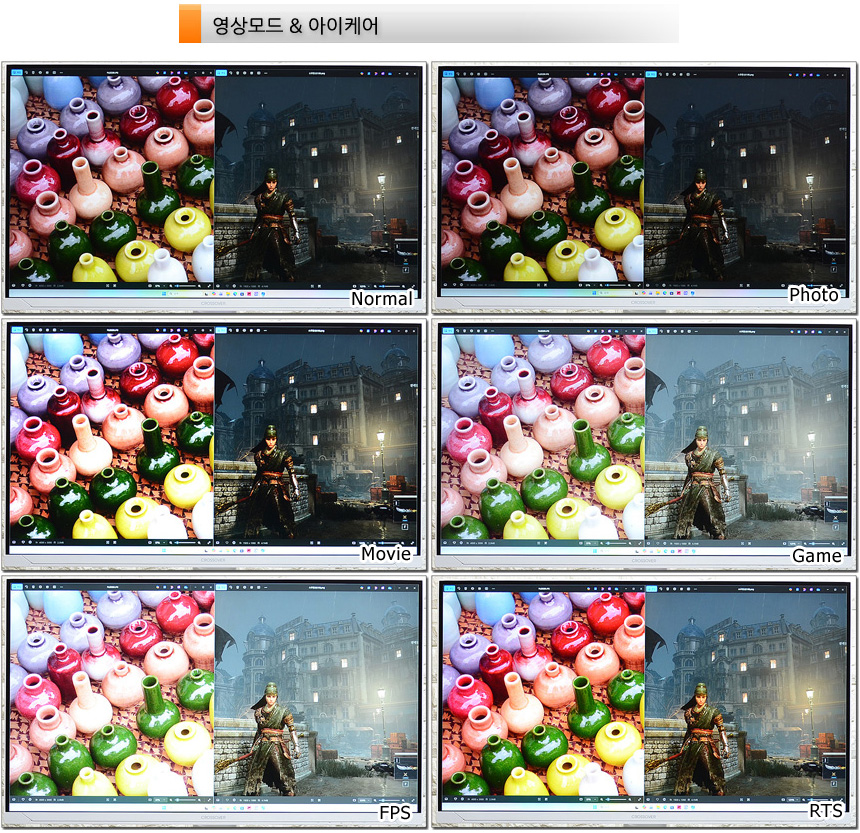 화면모드를 비교한 모습으로 밝기와 명암비에서 차이가 확연한 것을 확인할 수 있었다. 평소에서는 일반 모드를 사용하다가 (밝기 50%) 작업이나 게임을 할 경우 그에 맞는 모드로 변경해 최상의 영상을 즐길 수 있다.