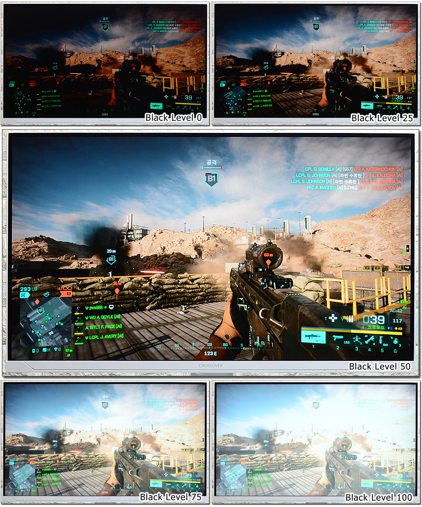 암부의 명암비를 높여 어두운 곳에 숨어있는 적을 쉽게 발견할 수 있도록 하는 블랙레벨을 지원한다. 상단의 사진은 비교 테스트를 진행하고 있는 모습으로 값이 높아질수록 시인성이 개선되는 것을 확인할 수 있었다.