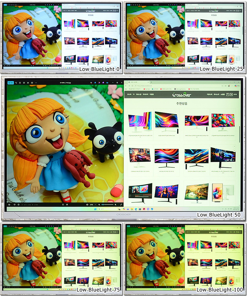 눈건강을 해치는 블루라이트의 감소 기능을 제공한다. 상단의 사진은 단계별 영상의 모습으로 설정값에 따라 차이가 발생하는 것을 확인할 수 있다.