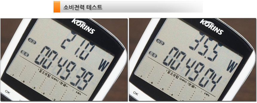 소비전력 테스트를 진행하고 있는 모습으로 50% 밝기에서 21W, 100% 밝기에서 35.5W 소비전력으로 작동했다. (고주사율 제품으로 일반 27형 모니터 대비 소비전력이 살짝 높은 편이다.)