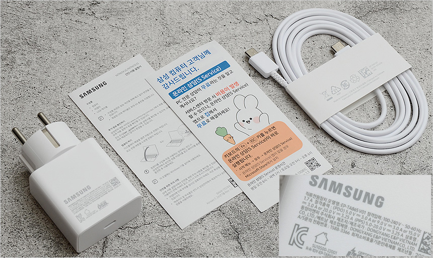 액세서리의 모습으로 65W 전원 어댑터를 비롯해 (작은크기로 쉽게 들고다니며 사용할 수 있다.) USB 케이블과 퀵 매뉴얼이 제공되는 것을 확인할 수 있다.