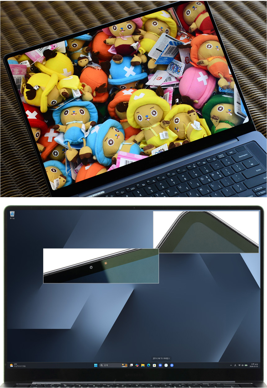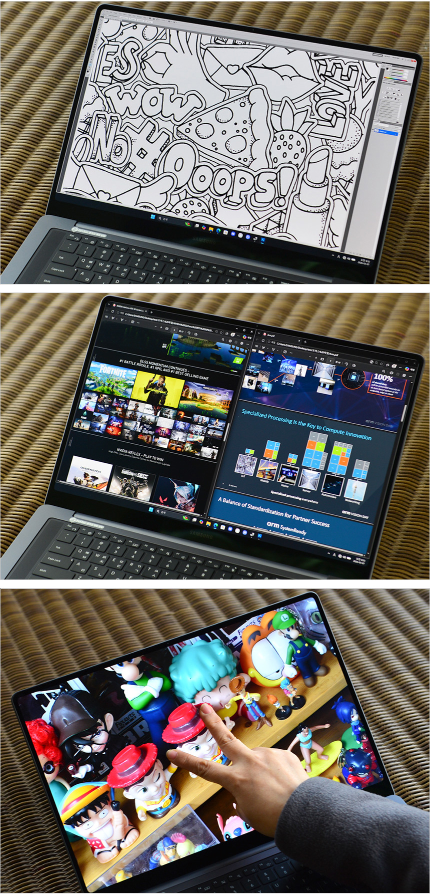 뛰어난 화질도 장점이라 할 수 있다. 16형 대화면의 고해상도 Dynamic AMOLED 2X 디스플레이를 탑재해 진한 색감을 즐길 수 있었으며 120Hz 주사율을 지원하고 블루라이트 감소 기술, 저반사 패널도 적용되어 장시간 사용시에도 눈이 상당히 편했다. 뿐만 아니라 터치를 지원해 편하게 노트북을 조작할 수 있었으며 HDR 1000nits로 밝기가 높아져 더 사실감 넘치는 영상을 즐길 수 있었다.
