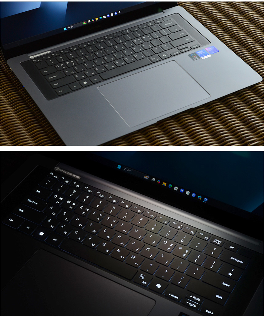 키보드의 모습으로 16형 대화면을 지원함에도 텐키리스 방식이 적용된 것을 확인할 수 있다. NUM 키패드가 없어 숫자입력이 많은 엑셀등을 사용할 때 약간의 불편이 있긴 하지만 정중앙에 키보드가 위치해 (텐키방식은 좌측으로 쏠린다.) 더 편하게 안정적인 타이핑이 가능하다. 또한 LED 백라이트가 설치되어 야간에도 불편없이 사용할 수 있다. (단축키를 통해 ON/OFF와 밝기 조절이 가능하다.)