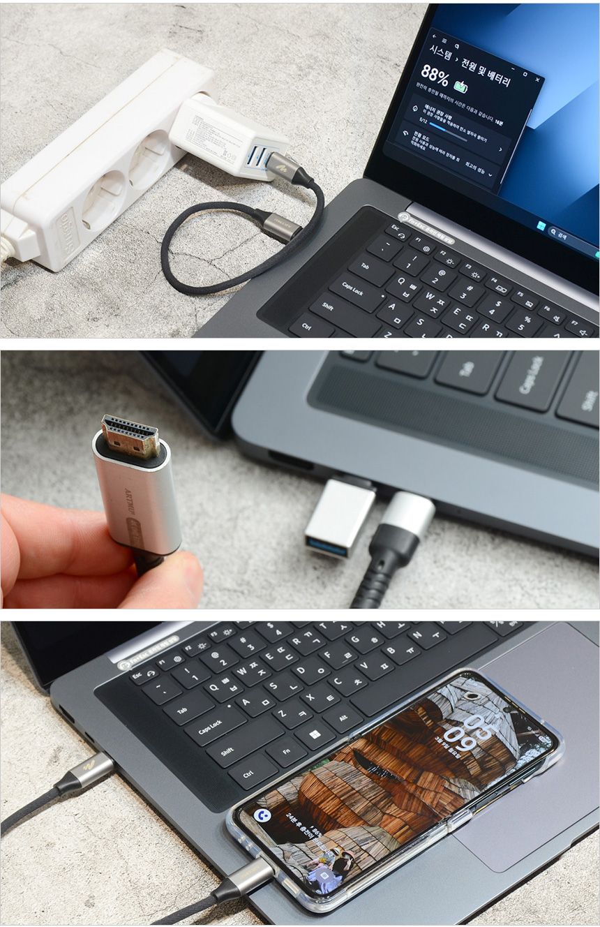 썬더볼트 4 단자는 빠른 데이터 전송이 가능할 뿐만 아니라 상시전원 지원으로 노트북이 꺼진 상태에서도 스마트폰 충전용으로 사용할 수 있다. (삼성 셋팅에서 기능을 설정해야 한다.) 또한 젠더를 사용하면 A 타입의 일반 주변기기 사용이 가능하고 디스플레이 출력을 지원해 모니터를 연결할 수 있다. 뿐만 아니라 PD충전을 지원해 기본 충전기 뿐만 아니라 PD 충전기를 사용해 전원을 공급할 수 있다.