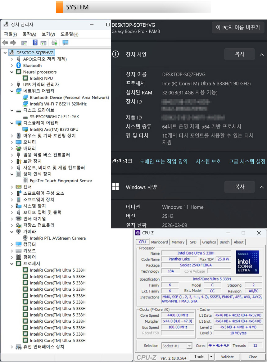 시스템 정보를 확인하고 있는 모습으로 4P+4E+4LP 코어에 20MB+18MB 캐시를 지원하는 인텔코어 울트라 5 338H 프로세서가 탑재된 것을 확인할 수 있다. 인텔 18A 공정으로 설계된 팬서레이크 프로세서로 기존 모바일 프로세서와는 확연히 비교되는 강력한 성능을 경험할 수 있다.